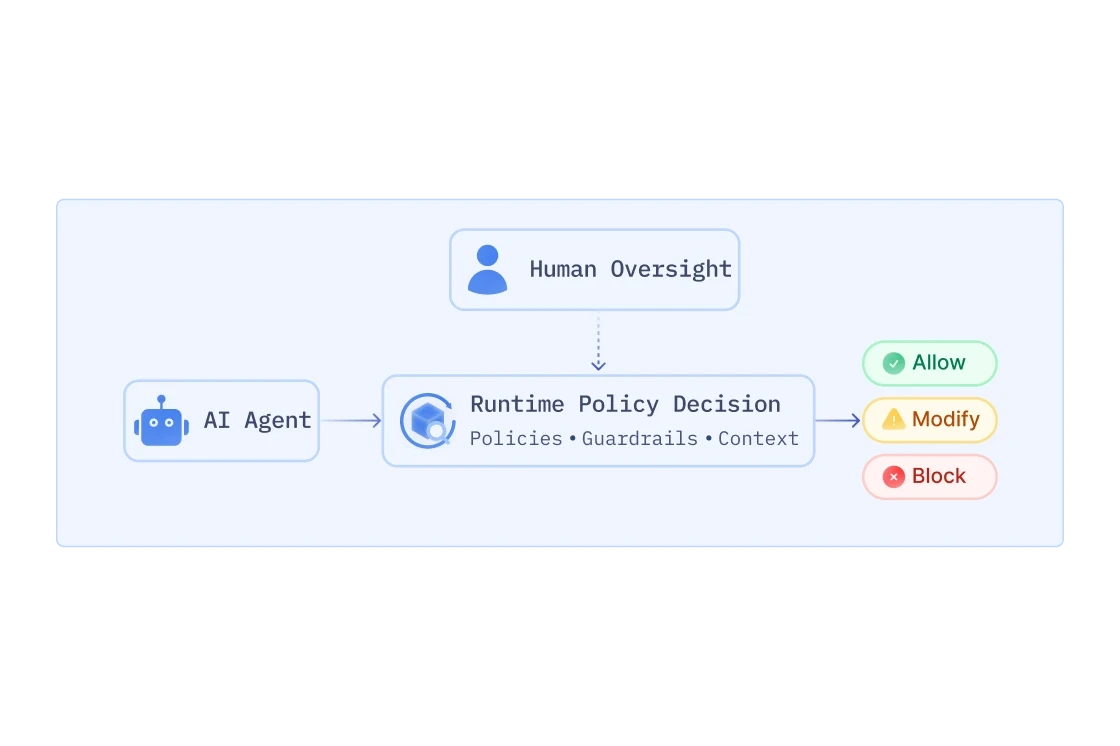 Enforce policies and controls dynamically in real time, with governance that understands how agents interact, execute, and evolve.
