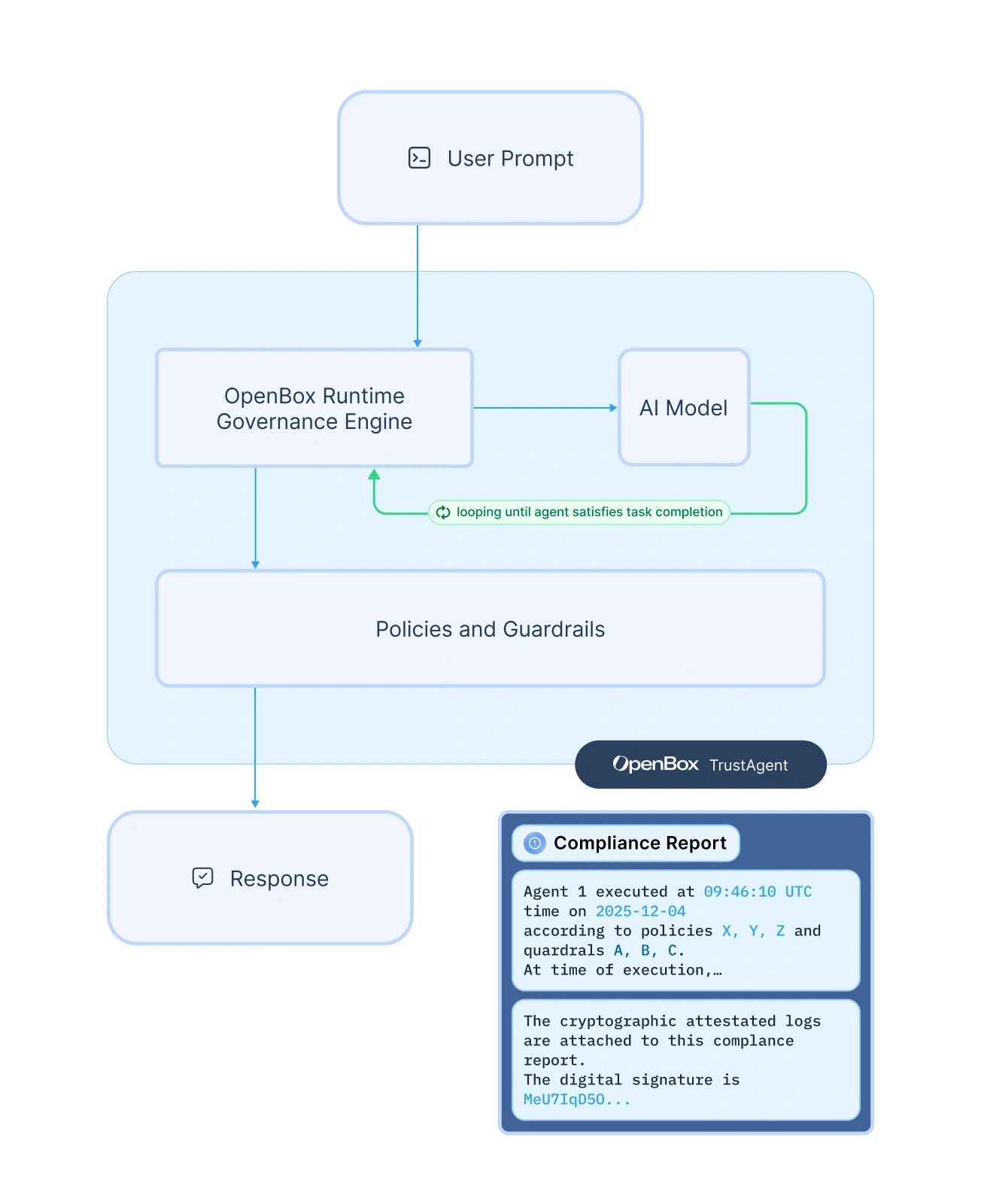 The Runtime Governance Engine intercepts every agent action – verifying identity, enforcing policies and guardrails, scoring risk in real time, and producing a signed compliance report.